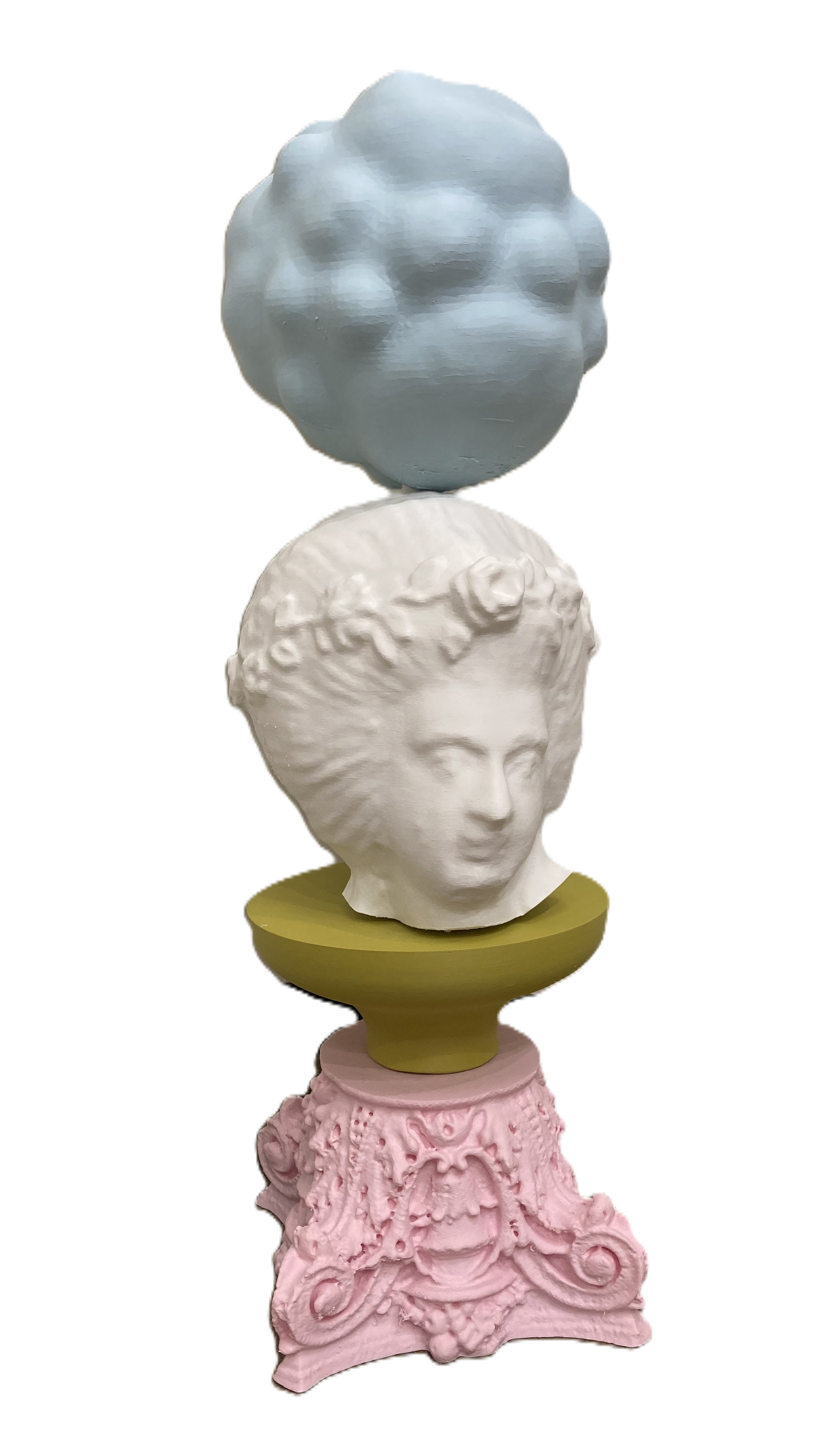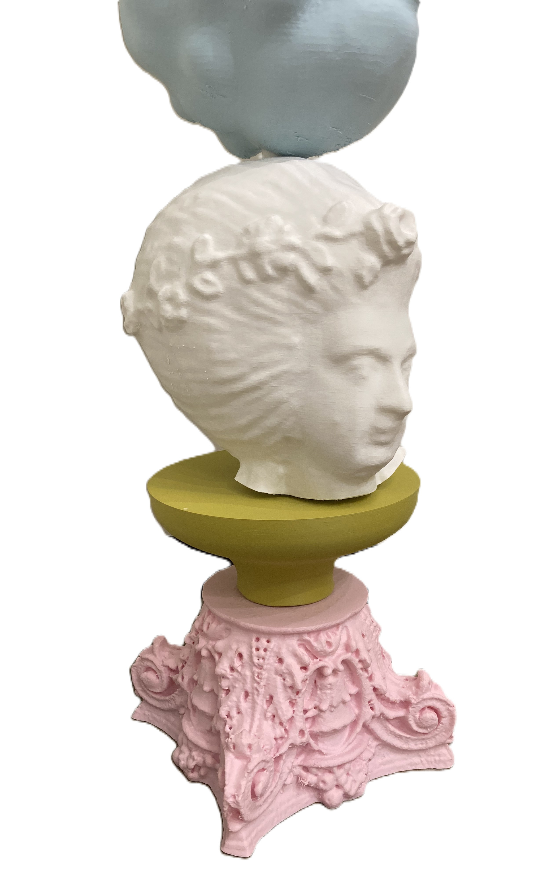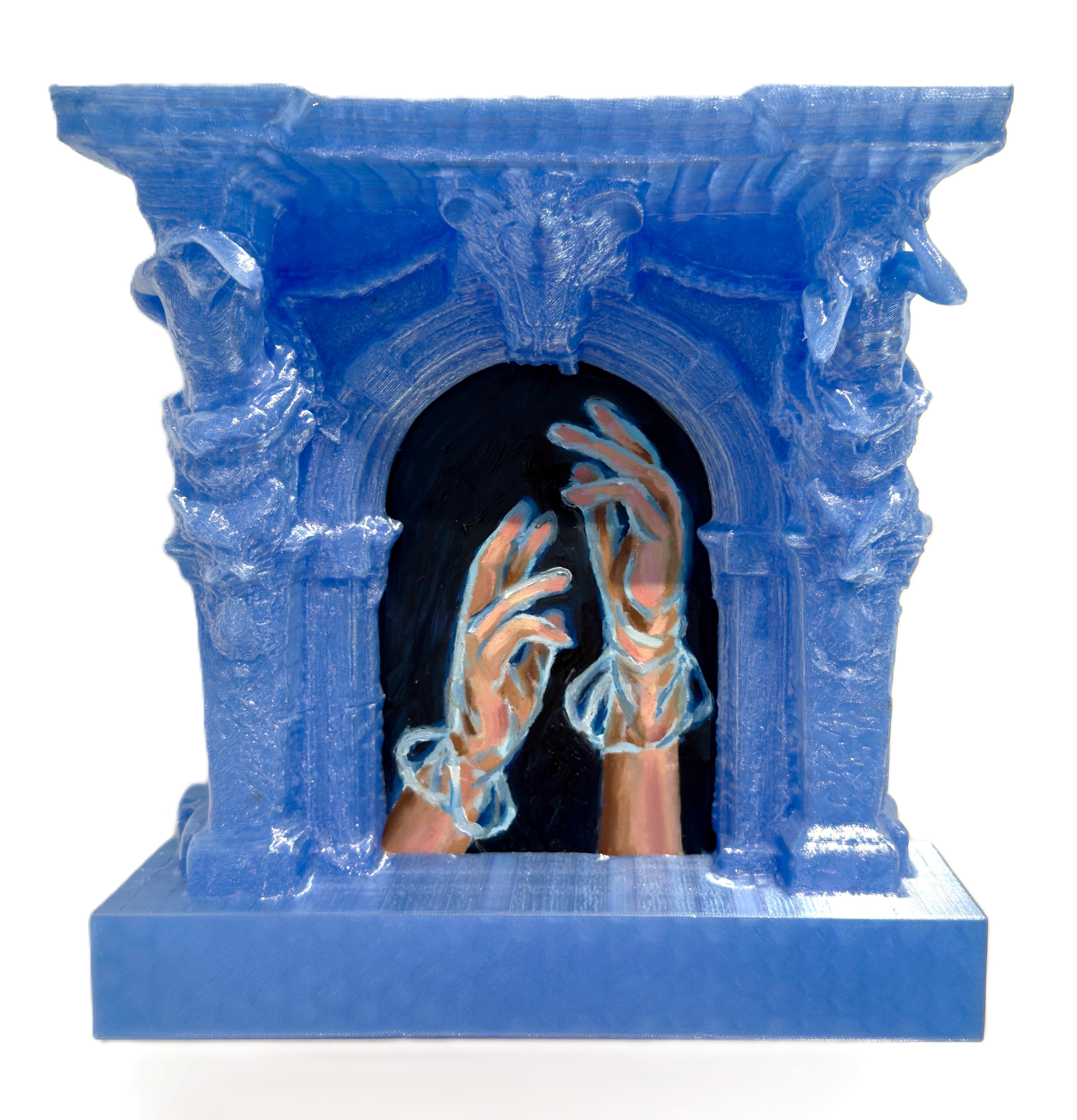 Together, the works in Cheap Opulence explore shifting ideas of value, access, and authorship. In 3D printed form, these artifacts might seem to outlast us, yet their biodegradable nature ensures they decompose like flesh. Their historical weight is undercut by infinite replicability. Once removed from their original sources, they become something else entirely. These miniatures lean into camp and whimsical excess, transforming historical fragments into playful performers on a global stage that begins right here in Columbus, Indiana.
