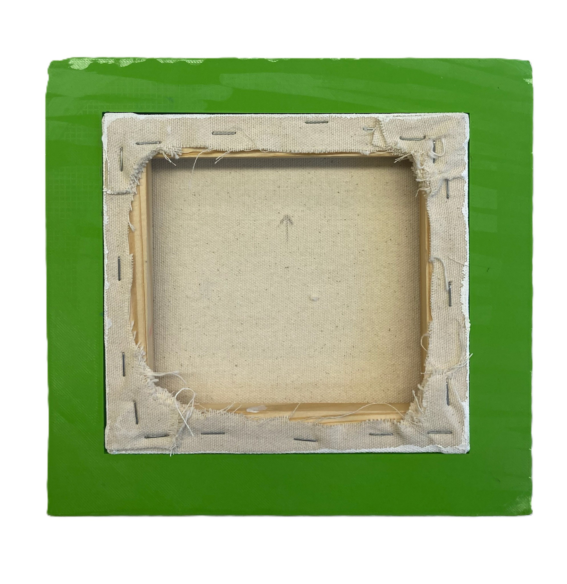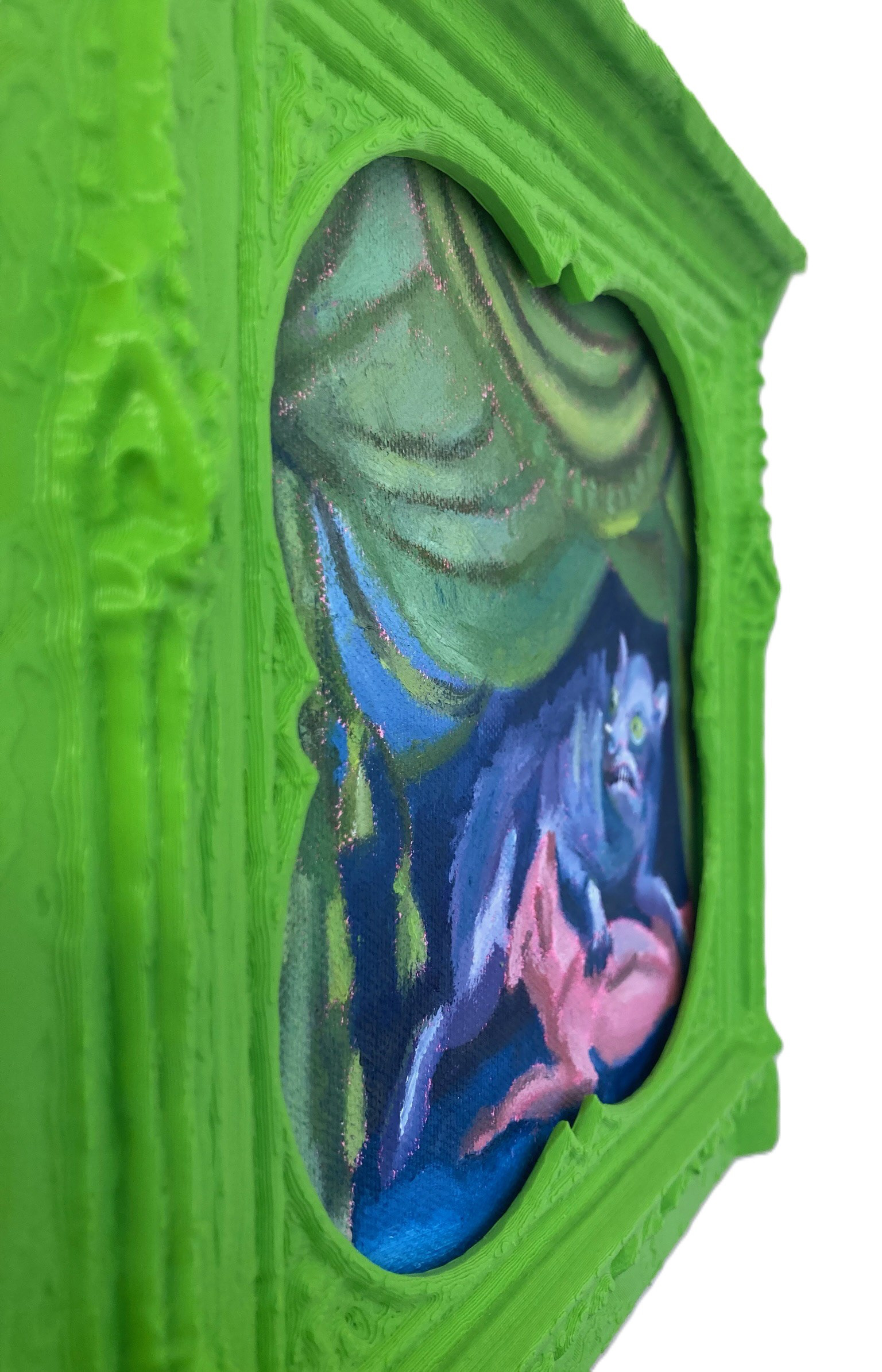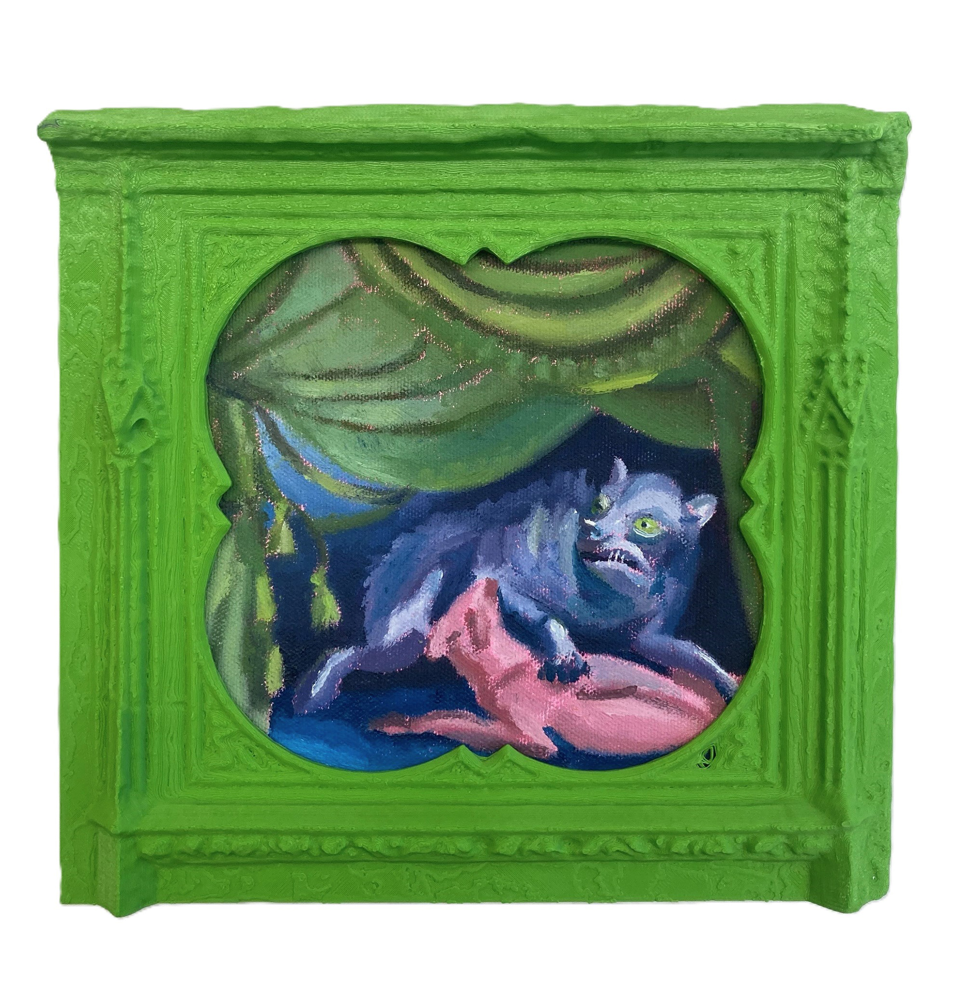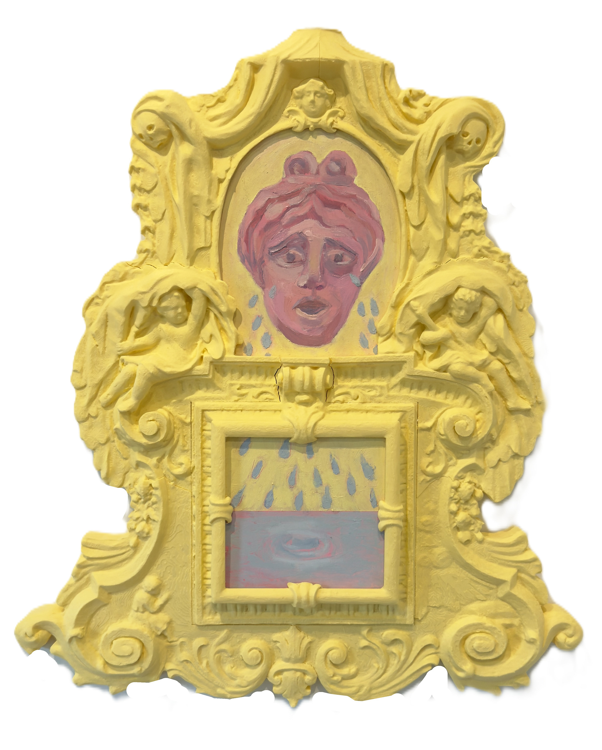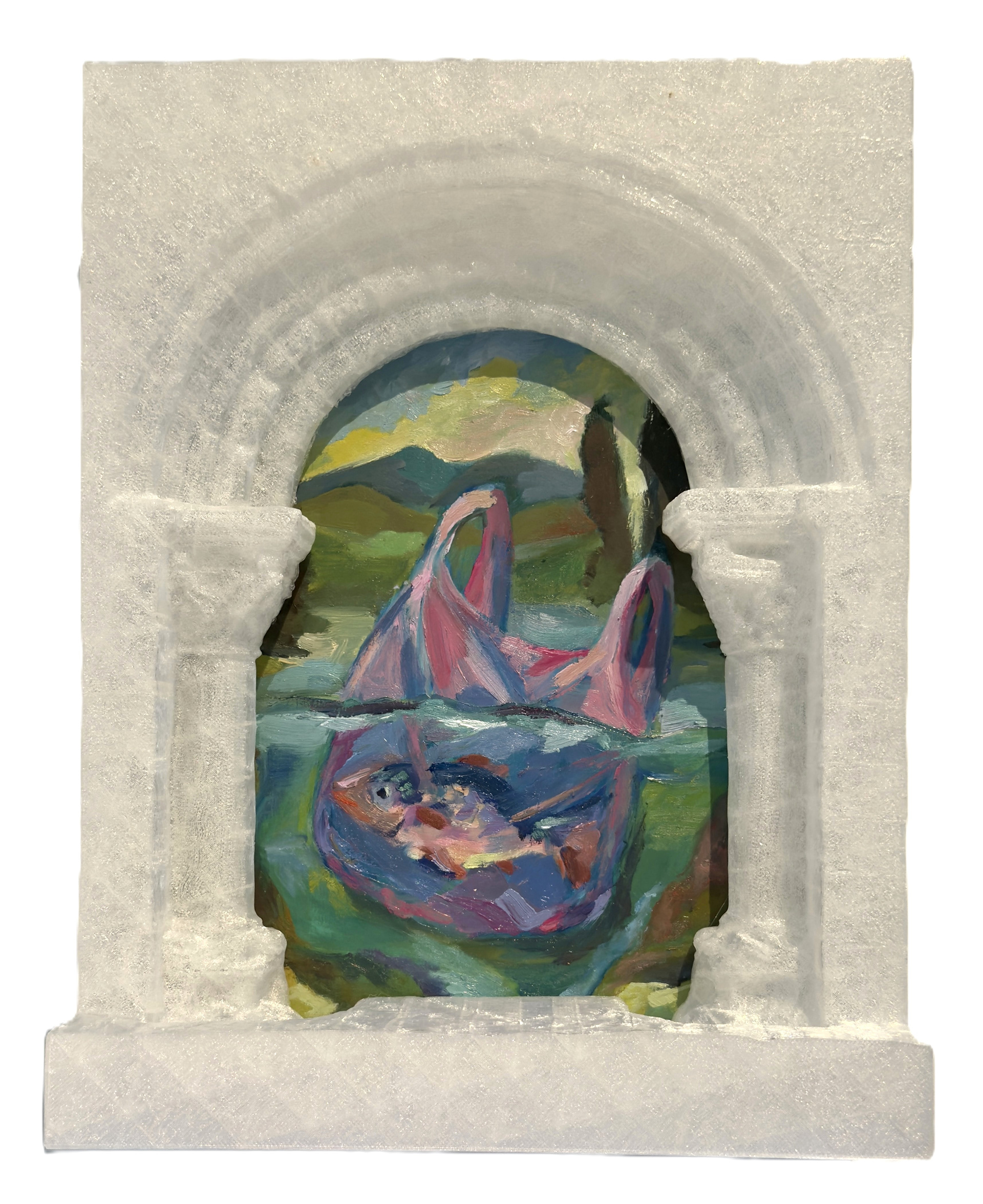 A recurring form in the exhibition is based on a 17th-century Baroque frame by Antonio Carlone, found on the exterior of the Cathedral of St. Veit in Austria. In this context, it has been sliced and reworked into a visual backdrop for painted compositions, turning a once-fixed architectural flourish into a portable, theatrical device.