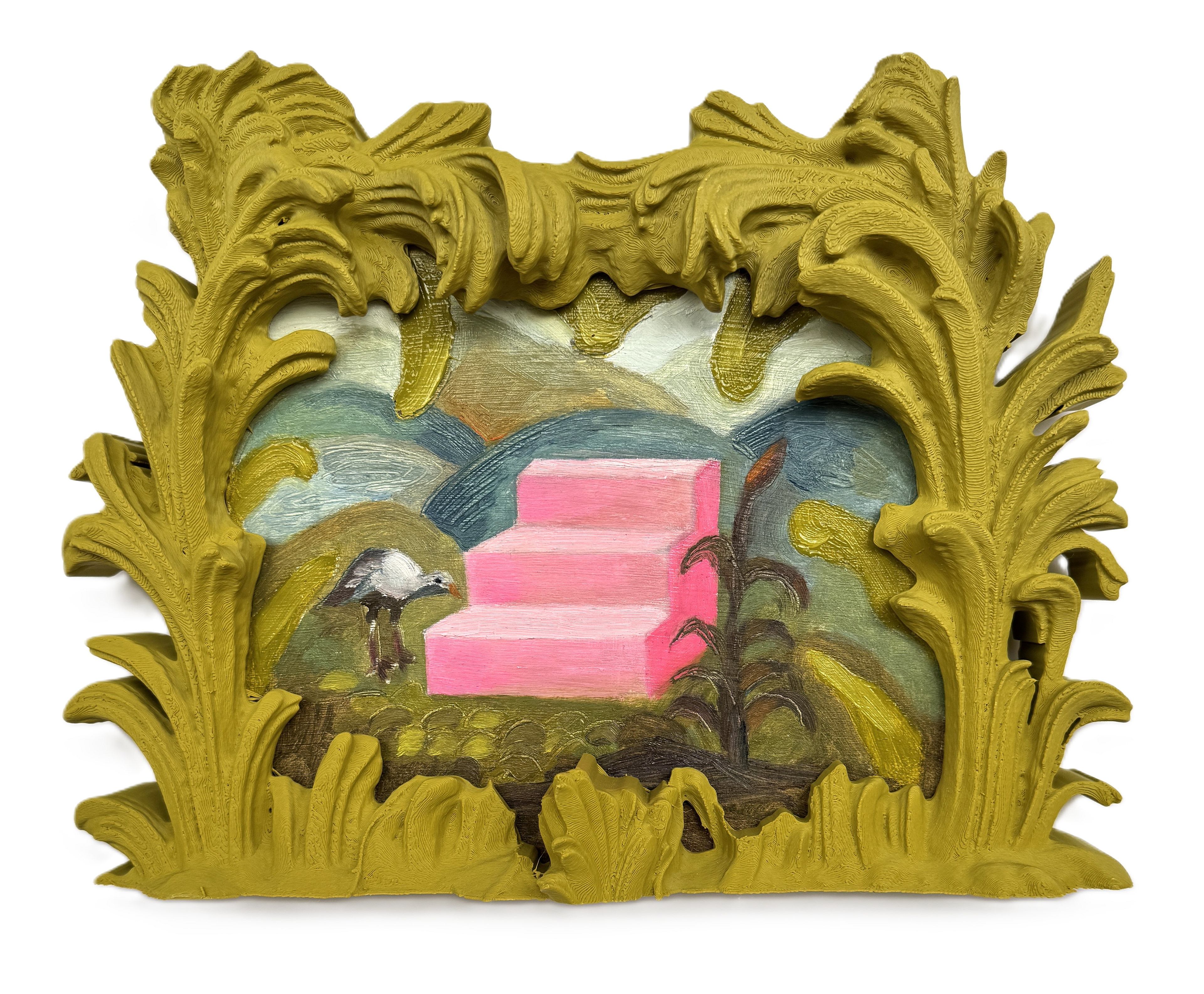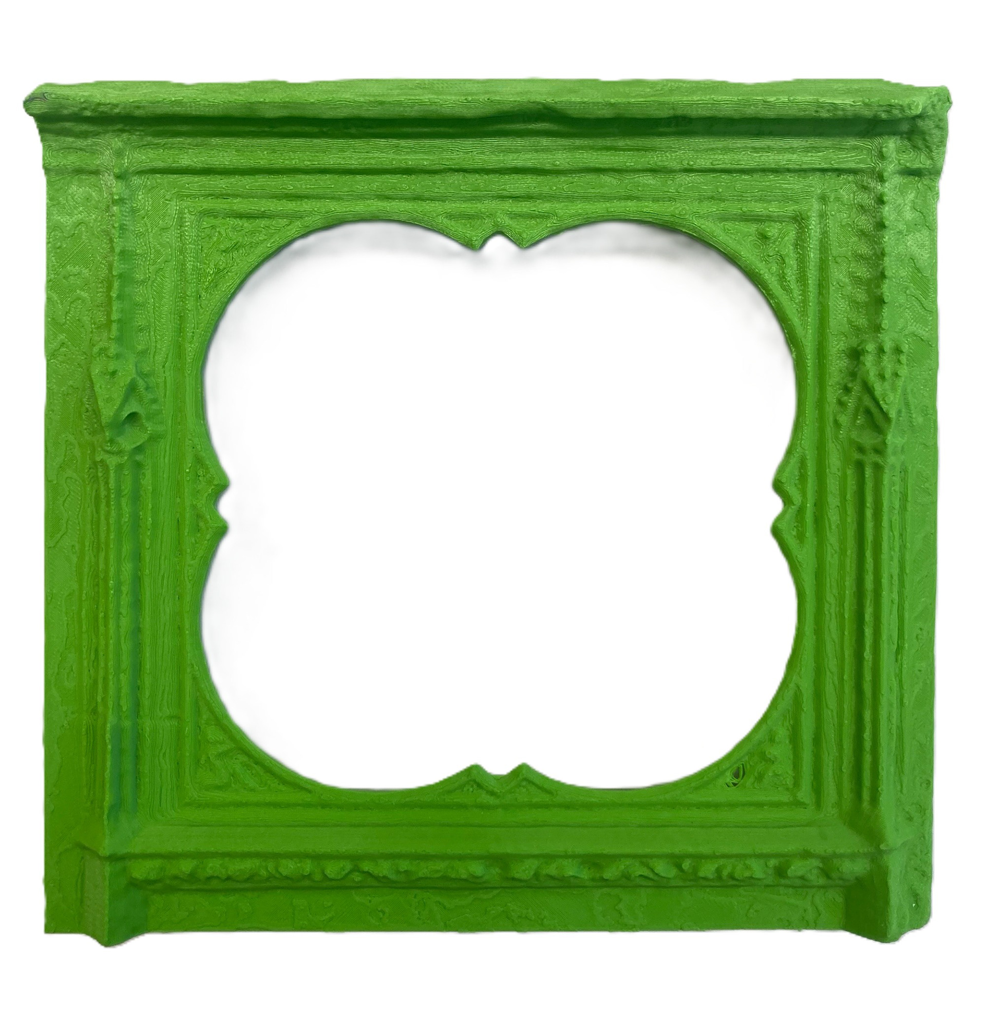 At the heart of the show are ornate frames, many of which were created using 3D scans sourced from museum archives and historic buildings across Europe. Once scanned, the imagery becomes distorted and digitized, removing it from its original context and function. Meza digitally edits and reconfigures these fragments, transforming them into contemporary sculptures made from biodegradable PLA derived from corn. The final iteration is a mere whisper of its original counterpoint.